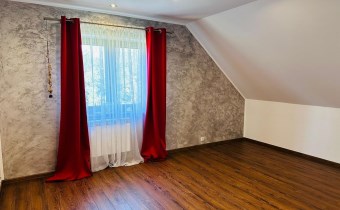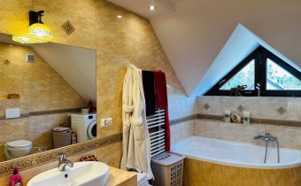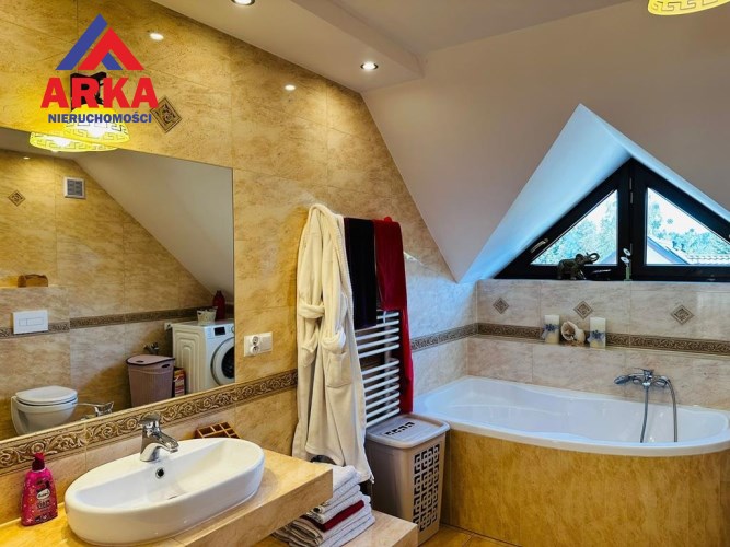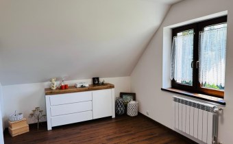 PODDASZE: 3 sypialnie (15,90m2, 14,85m2 i 15,60m2), łazienka (8,00m2), garderoba(12,65m2), oraz komunikacja (7,45m2). Na podłogach w sypialniach i korytarzu panele w kolorze dębu, w łazience -płytki.