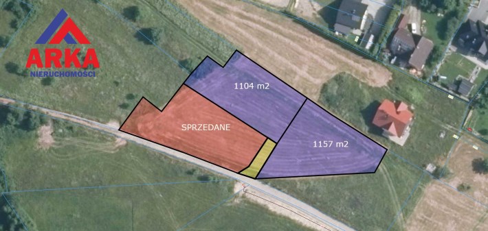 Do wyboru nabywcy jest jedna z dwóch widocznych na mapie działek o następujących powierzchniach: 1104 m2, 1157 m2. Do działek prowadzi szeroka (5-metrowa) droga wewnętrzna, która połączy je z drogą gminną.