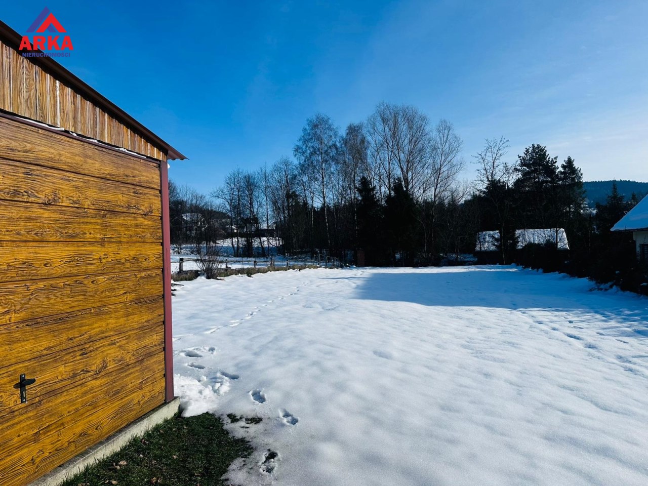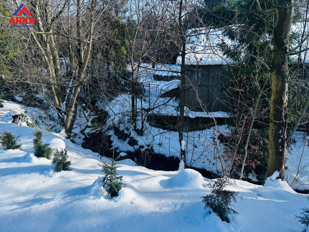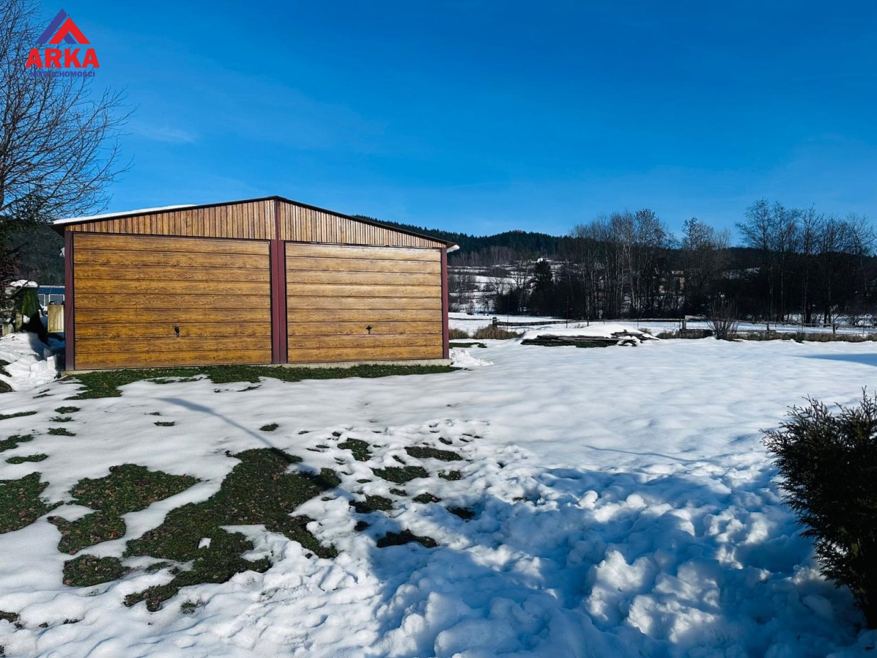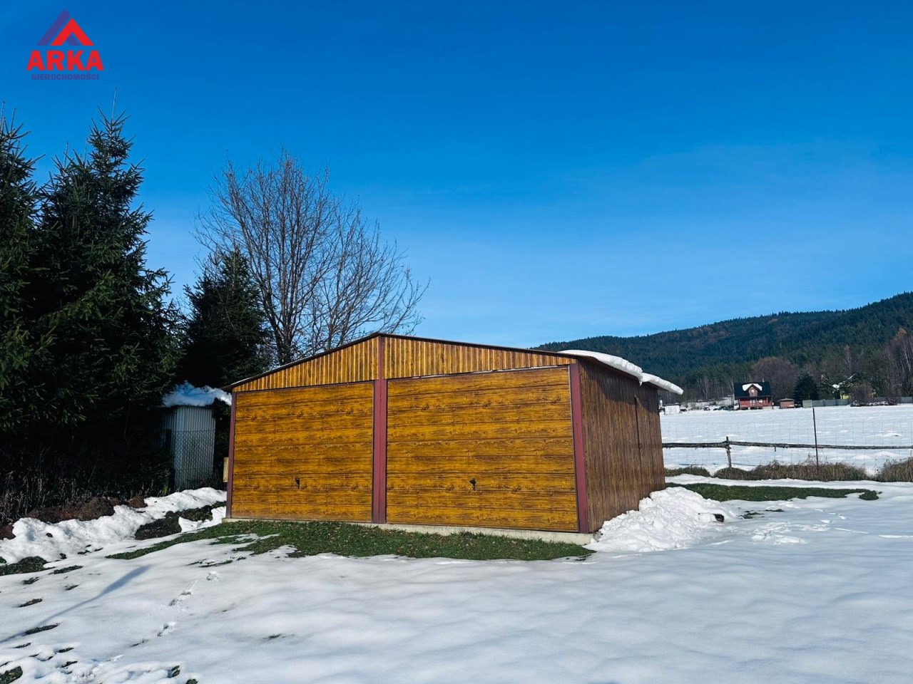 Na działce (wzdłuż dwóch granic) znajdują się liczne nasadzenia krzewów i drzewek iglastych oraz krzew porzeczki, a ponadto posadowiony jest na niej nowy dwustanowiskowy garaż typu blaszak na betonowej podmurówce z izolacją oraz zbrojeniem. Od wewnątrz garaż ocieplony jest styropianem o grubości 5 cm, a na podłodze położone są płytki. Wnętrze właściciel zaadaptował częściowo w celach noclegowych (jest kanapa, kuchenka, piecyk itp.).